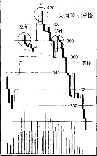 以加权股价指数为例,1975年底多头市场重新展开,自12月15日的292.03点直冲388点,然后滑落至365.23点为第一段,是“左肩”;随即回升至415.64,再跌至359.86为第二段。是“头”;又回升至388.72,回落至348.91为第三段,是“右肩”。头肩顶形成后,指数自然下落一段(图头肩顶示意图)。从成交值观察,亦是标准形态,左肩与头部成交值都大,而右肩成交值无法放大,量价相配合,终于跌破颈线。